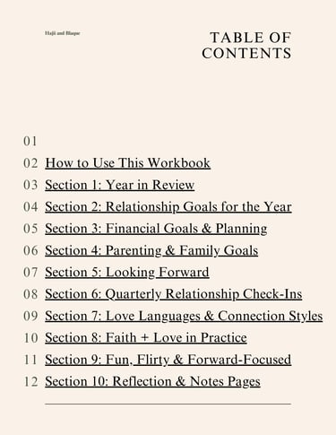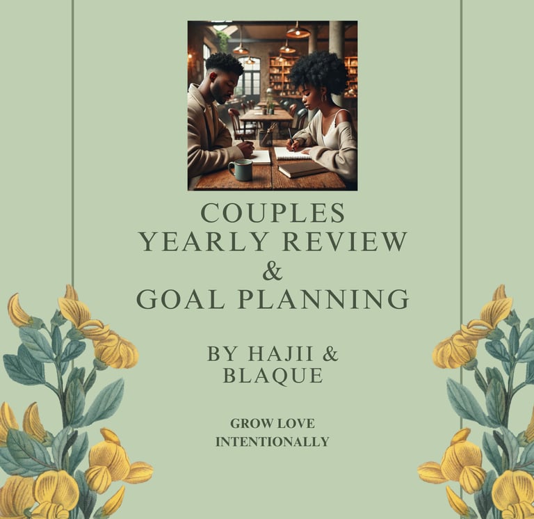 Elevate your relationship with the Couples Yearly Review & Goal Planning Guide, thoughtfully crafted by Hajii & Blaque. This elegant, professionally designed workbook empowers couples to reflect deeply on the past year, celebrate achievements, and tackle challenges together. Packed with insightful prompts and engaging exercises, it encourages open communication, strengthens emotional connection, and inspires shared growth. With plenty of room for notes and action plans, this guide is perfect for cozy evenings or special anniversary moments. Available in a digital format, it's the ultimate gift for couples committed to building a vibrant future together.Write your text here...