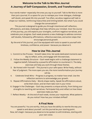 Discover a new path to self-empowerment with Talk to Me Nice: A Prompted Journal. Thoughtfully crafted to transform your inner dialogue, this journal guides you through inspiring exercises and uplifting affirmations, helping you nurture a more compassionate and confident mindset. Perfect for daily reflection and personal growth, its convenient size makes it easy to keep by your side at home or on the go. Featuring a durable hardcover in a calming pastel shade, this journal is both beautiful and practical, a must-have addition to your wellness routine.